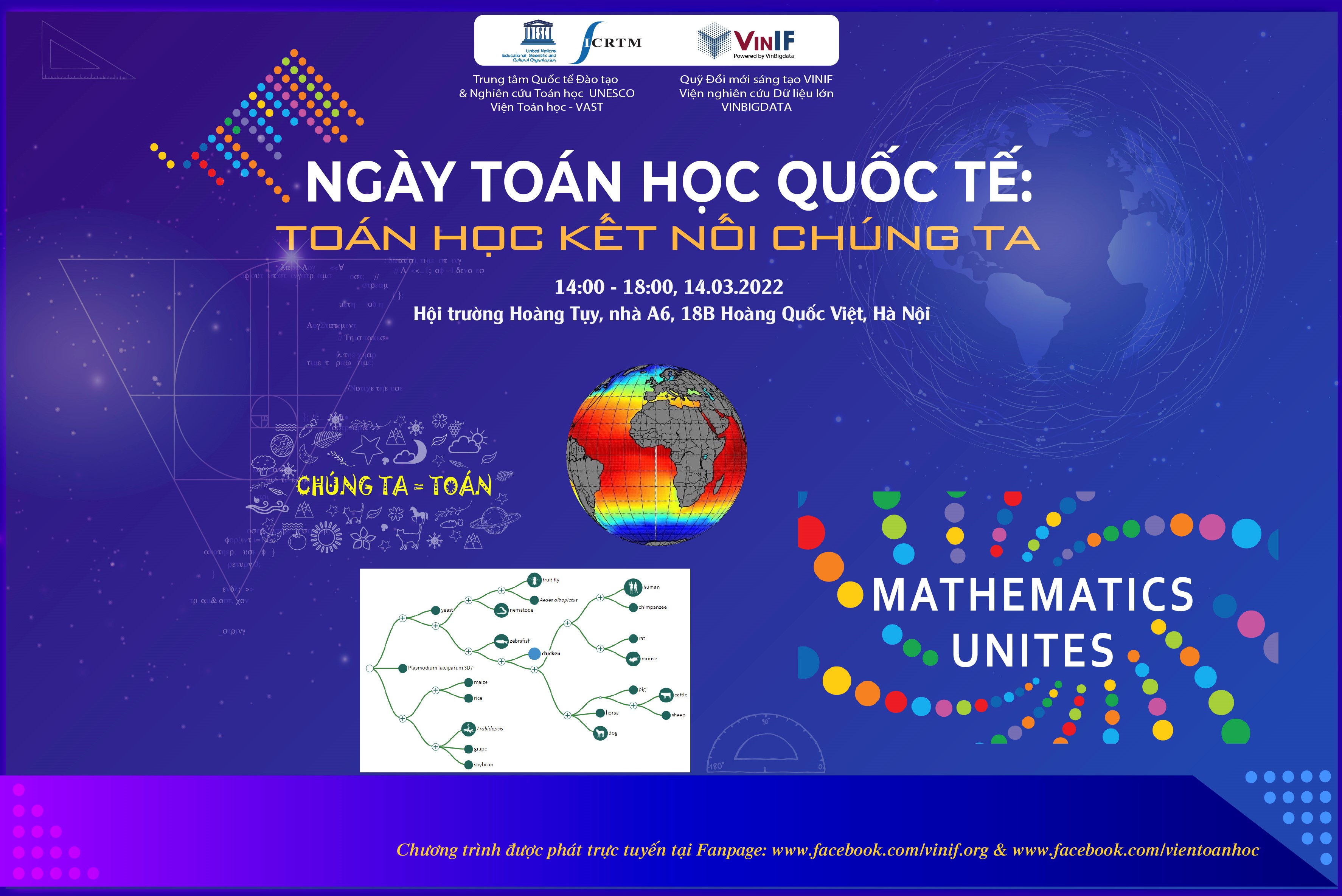 Còn bạn, bạn hiểu thế nào về Mathematics Unites? Và bạn muốn tìm hiểu thêm về điều đó? Hãy cùng đến với "Ngày Toán học quốc tế 2022: Toán học kết nối chúng ta" được tổ chức vào đúng ngày Pi: 14/03/2022 để lắng nghe các bài giảng đại chúng và buổi tọa đàm của các chuyên gia với các góc nhìn muôn hình muôn vẻ.